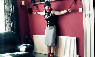 束缚荡妇的观点! 没有经验的下属斯凯被球塞住,绑在床架上玩耍